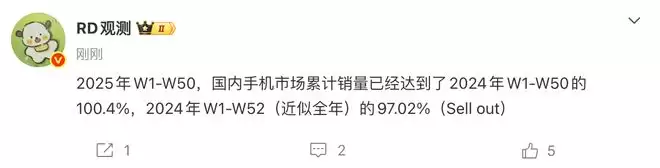 “RD观测”还透露,2025年前50周的累计销量,已经相当于2024年全年(W1-W52)销量的97.02%。考虑到2025年还剩半个月才结束,今年中国手机市场的总销量大概率将超过去年。
