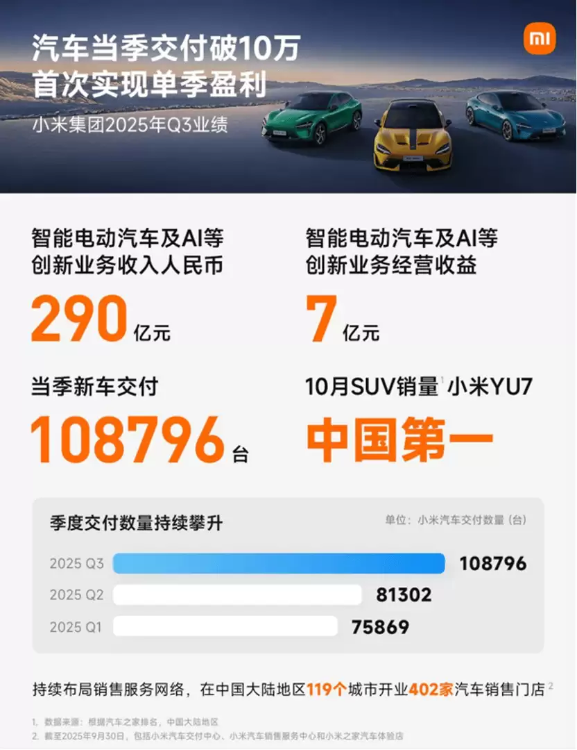 2025年第三季度财报公布,小米汽车业务以290亿元营收、199.2%的同比增速引发行业震动,更以连续6个季度实现盈利的效率刷新了中国新能源车企的纪录。全年36万辆的交付量与25.5%的毛利率,配合26.2万元的单车均价,彻底打破了传统汽车产业“价格-销量-利润”的三角悖论。这场由互联网思维驱动的造车运动,正以颠覆性姿态重塑行业规则。