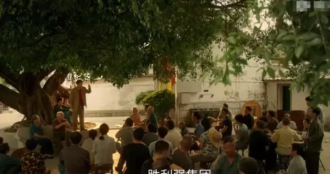 村头一棵大树,树下聚集了村里的村民,然后有一个人站在高处,宣布事情的画面,很有年代感。