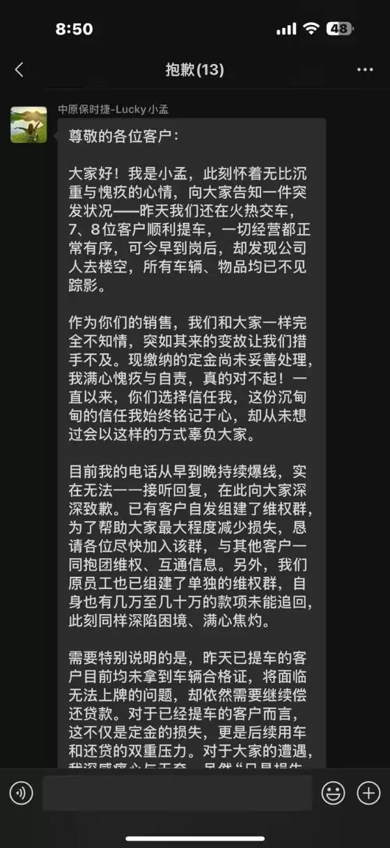 随着情况进一步发酵,一份由该店销售顾问“小孟”发送给客户的《致客户书》在多个车主维权群内流传。根据“小孟”的描述,12月22日门店仍处于正常经营状态,当天还有多位客户顺利提车。然而12月23日早晨员工到岗时,发现展厅车辆已被清空,公司高层失联,员工事前对此毫不知情。这一突如其来的变故使得已支付定金的消费者、近期提车但未拿到车辆合格证的车主,以及购买预充值服务的客户均陷入困境。