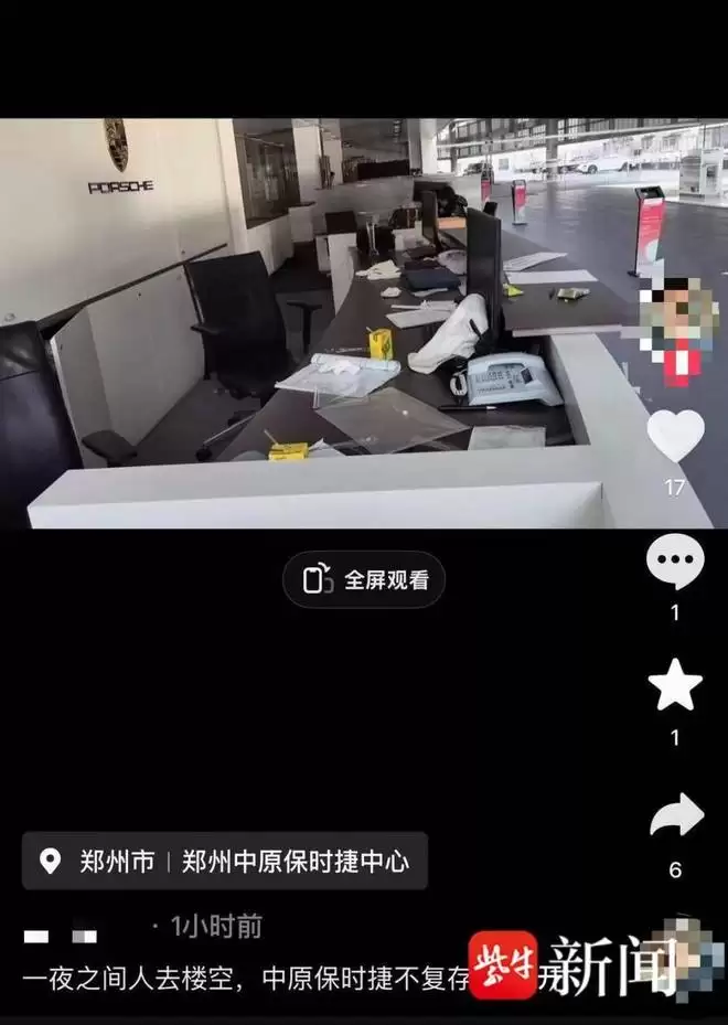 网友发帖称郑州中原保时捷中心突然人去楼空