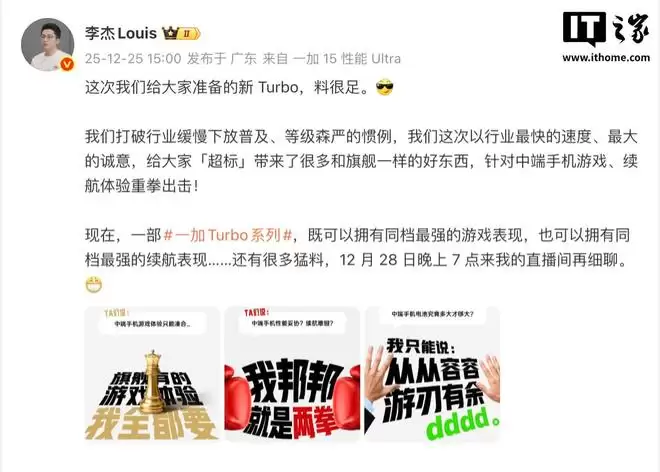 12月25日,IT之家报道,一加手机中国区总裁@李杰Louis在社交平台发文透露:“这次我们准备的新品Turbo系列,料真的很足。”