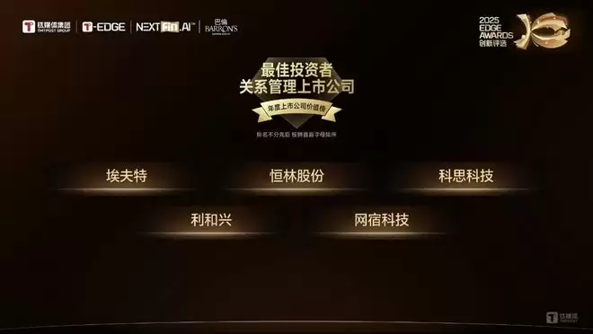 2025年12月,在钛媒体集团携手NextFin.AI、巴伦中国举办的2025 T-EDGE全球对话“上市公司年度价值榜”评选中,网宿科技(300017.SZ)凭借“高质量经营+高透明治理+高比例分红”的标杆实践,成功斩获“最佳投资者关系管理上市公司”奖项。此次获奖,既是对公司IR专业能力的肯定,更是对其高质量发展路径的深度认同。