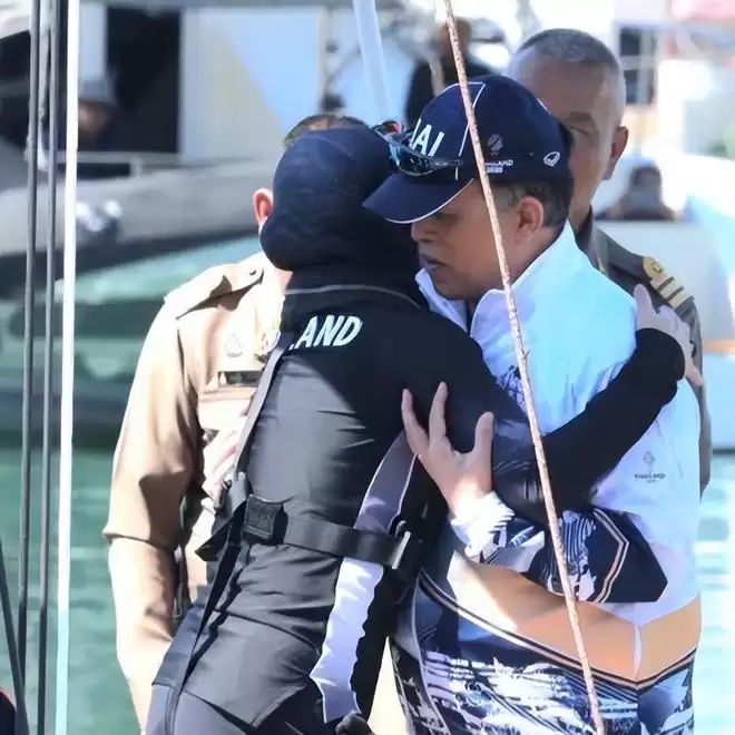 等到苏提达换上队服准备登船时,她又甜蜜地拥抱了泰王一下。