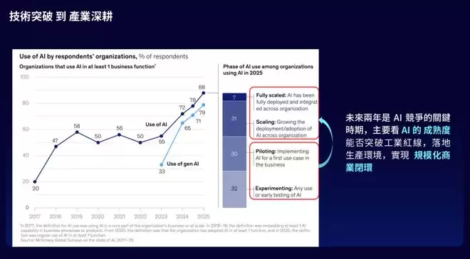 从产业角度看,麦肯锡研究报告显示,2017年可能有20%的受访企业在有限度采用AI技术;而到了2025年,这个比例已经上升到了88%。这份报告还将企业使用人工智能技术的深入程度分成了4个不同阶段,从简单实验、PoC,到规模化应用,再到全流程、全规模部署。