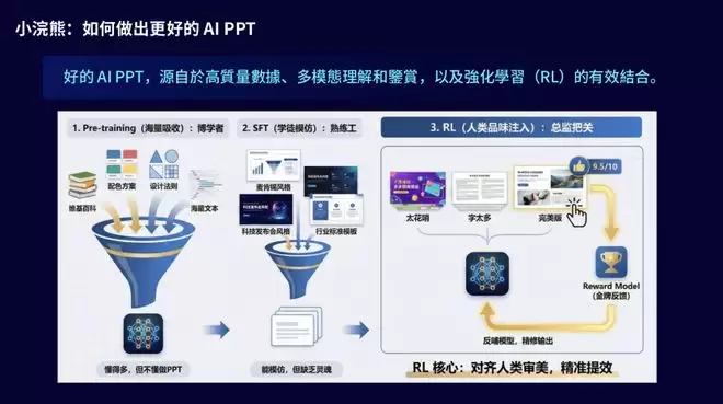在技术上,将人对PPT的审美和评判转化为奖励模型。我们基于不同的评判维度,比如内容结构,审美风格等等,做了多个不同的奖励模型,整合在一起,通过强化学习(Reinforcement Learning)来牵引模型的迭代,让它逐渐学会产生更高质量的PPT。