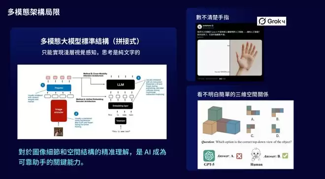 举个简单的例子,Grok-4在各种学科测试都具备非常高的水平,但问它图中有多少根手指,告诉我5根,而图中实际为6根。说明它看到是一只手之后,就开始做语言推理,并没有真正理解图片,所以结果完全错误。