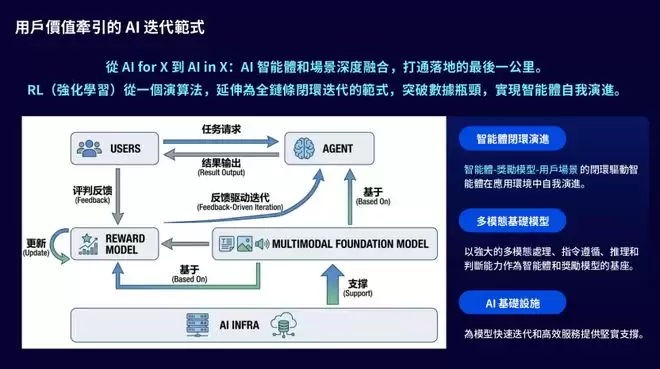 在这个闭环中,用户提出请求,AI智能体输出结果,用户在使用这个结果的过程中,我们的系统也会获得用户的反馈;然后用户的反馈也会注入到奖励模型,从而牵引模型的更新。