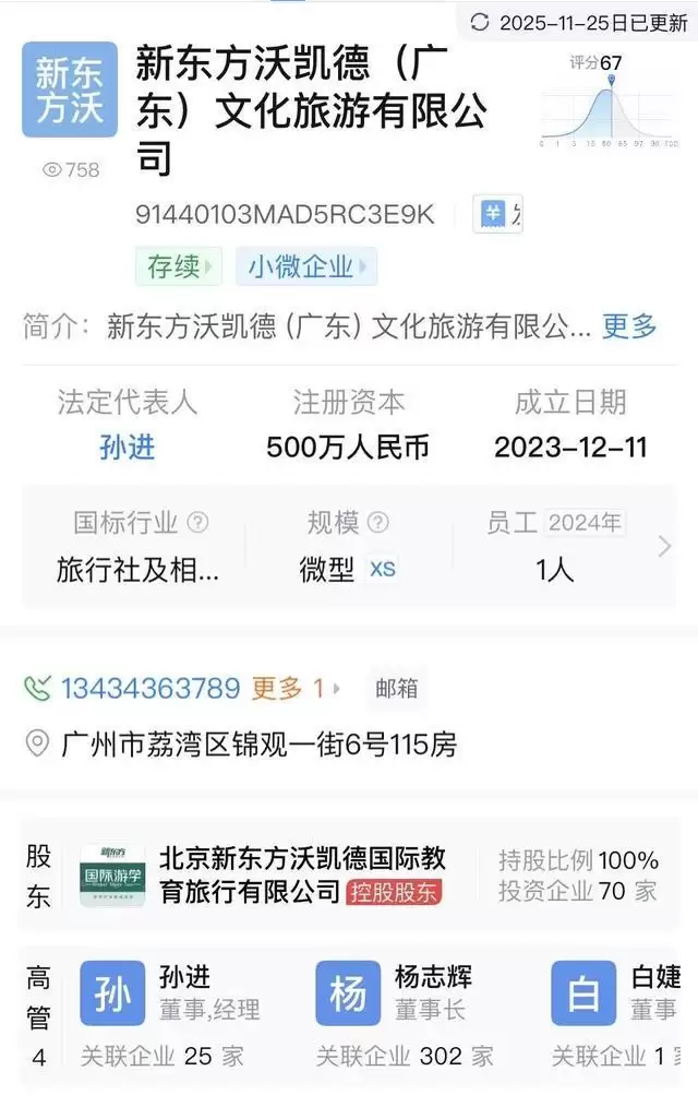 有意思报告整理公开资料发现,孙进在今年年初还曾以兼任华南新东方文旅总经理的身份亮相于公开场合,与此同时,他也是“新东方文旅”背后北京新东方沃凯德国际教育旅行有限公司旗下全资子公司新东方沃凯德(广东)文化旅游有限公司的法定代表人。