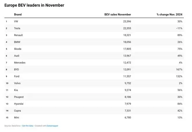 从品牌层面看,特斯拉的销量排名出现波动。10月份,其在欧洲纯电品牌综合销量中一度跌至第13位;11月份回升至第二,但已不再形成长期稳定的绝对优势。