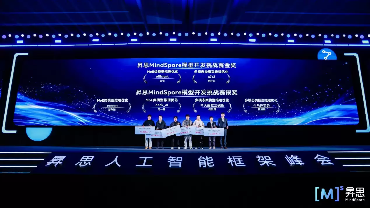 昇思MindSpore模型开发挑战赛聚焦前沿的MoE类和多模态类模型,考察参赛队伍在模型推理优化方面的实战能力。峰会上,本次挑战赛的金奖、银奖获奖选手接受颁奖。