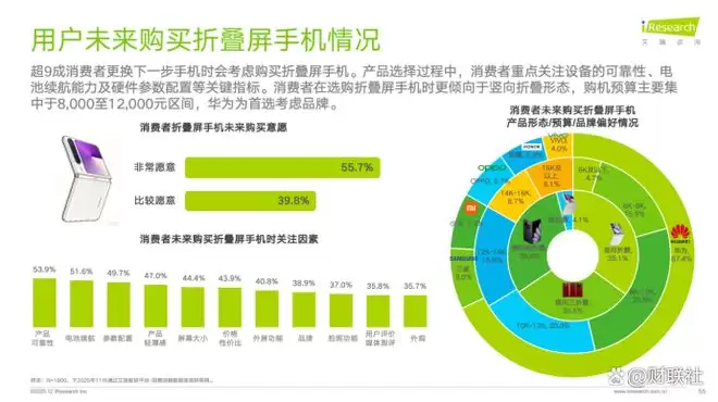 根据用户调研,95.5%的消费者表示未来愿意更换折叠屏手机。产品选择过程中,消费者重点关注设备的可靠性、电池续航能力及硬件参数配置等关键指标。华为则成为了首选考虑品牌,有67.4%的消费者倾向于购买华为的折叠屏手机。