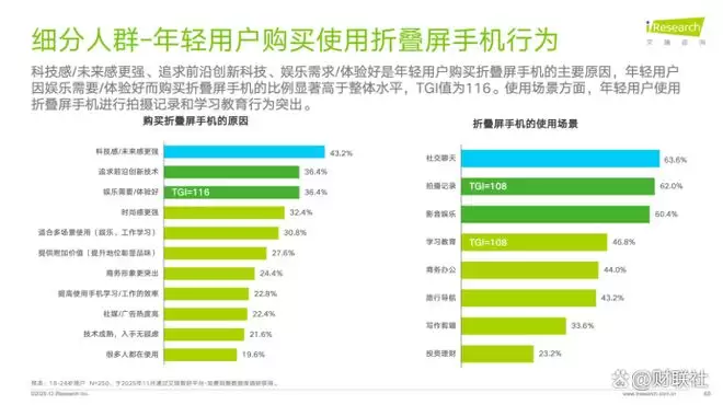 《报告》显示,年轻用户购买折叠屏手机的主要原因,包括科技感/未来感更强、追求前沿创新科技、娱乐需求/体验好。年轻用户因“娱乐需要/体验好”而购买折叠屏手机的比例,显著高于整体水平。此外,年轻用户也喜欢使用折叠屏手机进行拍摄记录和学习教育。