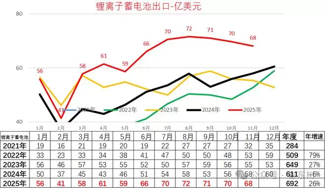 锂电池作为新三样的重要优势产品,出口表现优秀,利润高、市场好。自2020年拜登上台以来,中国出口商品中应该说锂电池的出口表现相对较为优秀。在2024年出口仅有284亿美元,2024年出口509亿美元, 2024年出口也达到了649亿美元的超高水平,但是到了2024年就出现了相应的增速放缓的情况。今年的锂离子电池出口基本保持在60亿美元左右的月度的平稳水平,7-10月上升到70亿美元的水平,11月回落到68亿美元,相当于去年的增长放缓。