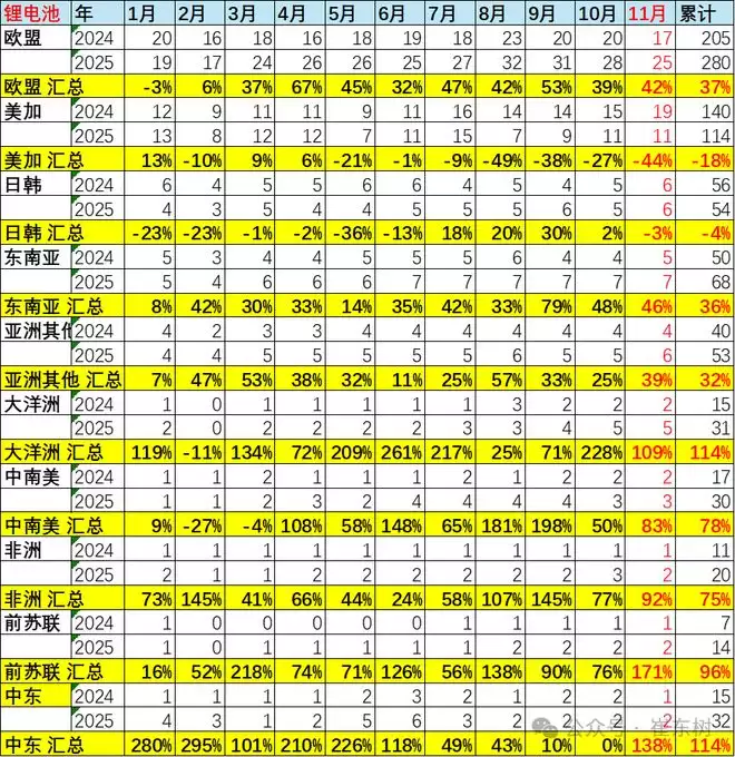 崔东树:11月我国锂电池出口分化,对欧盟增42%对美下滑