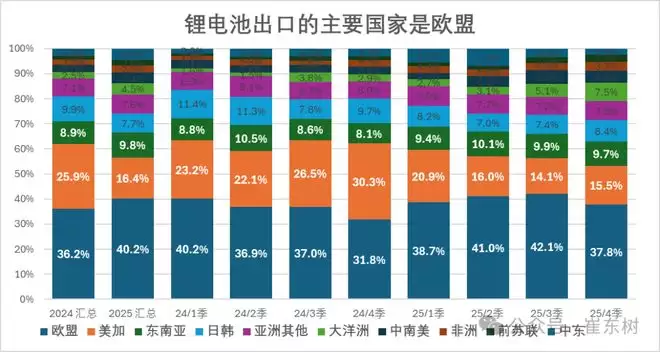 中国锂电池出口的主要市场是欧盟,欧盟的市场需求达到40%左右,2025年比2024年增长4个百分点。
