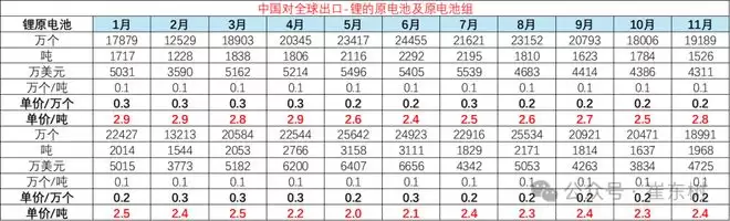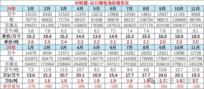 2025年11月的锂离子蓄电池出口4.47亿个,出口45万吨,11月出口达到68.1亿美元。从出口单价看今年的下降幅度较大,从2024年的1.8万美元/吨降到1.5万美元/吨。