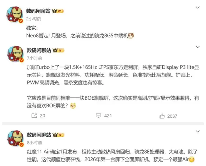而近期有爆料,红魔11 Air已出现在工信部数据库中,而真我副总裁徐起和一加总裁李杰也已开始为各自的新机Neo8和Turbo系列预热。