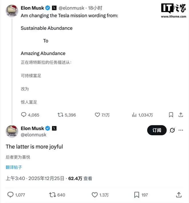 IT之家12月25日消息,马斯克最近分享了他的新愿景:希望为这个世界增添更多快乐。