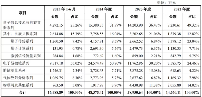 从2024年到2025年上半年(简称“报告期”),公司来自量子信息技术与自旋共振系列业务的营收占比从49.32%下降至25.26%,而来自电子显显微镜系列业务的营收占比则从24.46%提升至56.02%。相比之下,随钻测量、气体吸附分析、物联网等业务的营收占比较低。