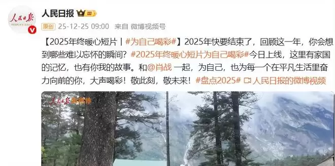 【2025年终暖心短片丨#为自己喝彩#】2025年快要结束了,回顾这一年,你会想到哪些难以忘怀的瞬间?#2025年终暖心短片为自己喝彩#今日上线,这里有家国的记忆,也有你我的故事。和@肖战 一起,为自己,也为每一个在平凡生活里奋力向前的你,大声喝彩!敬此刻,敬未来!#盘点2025