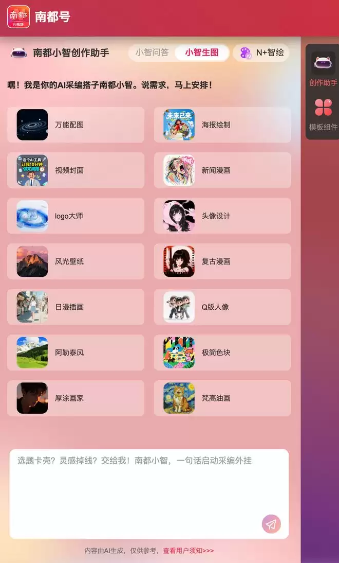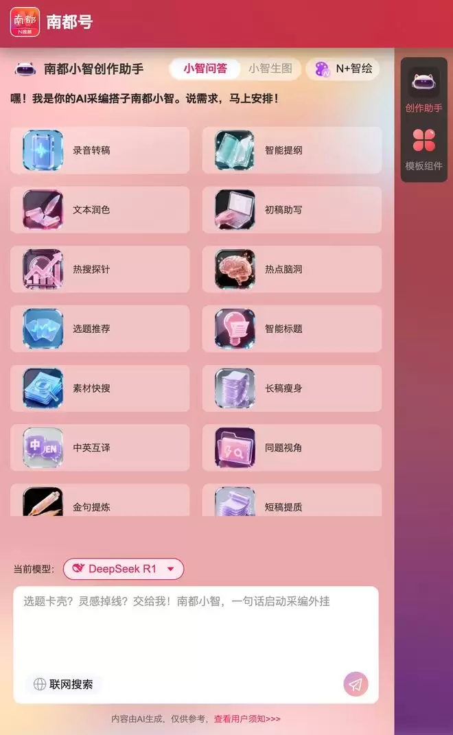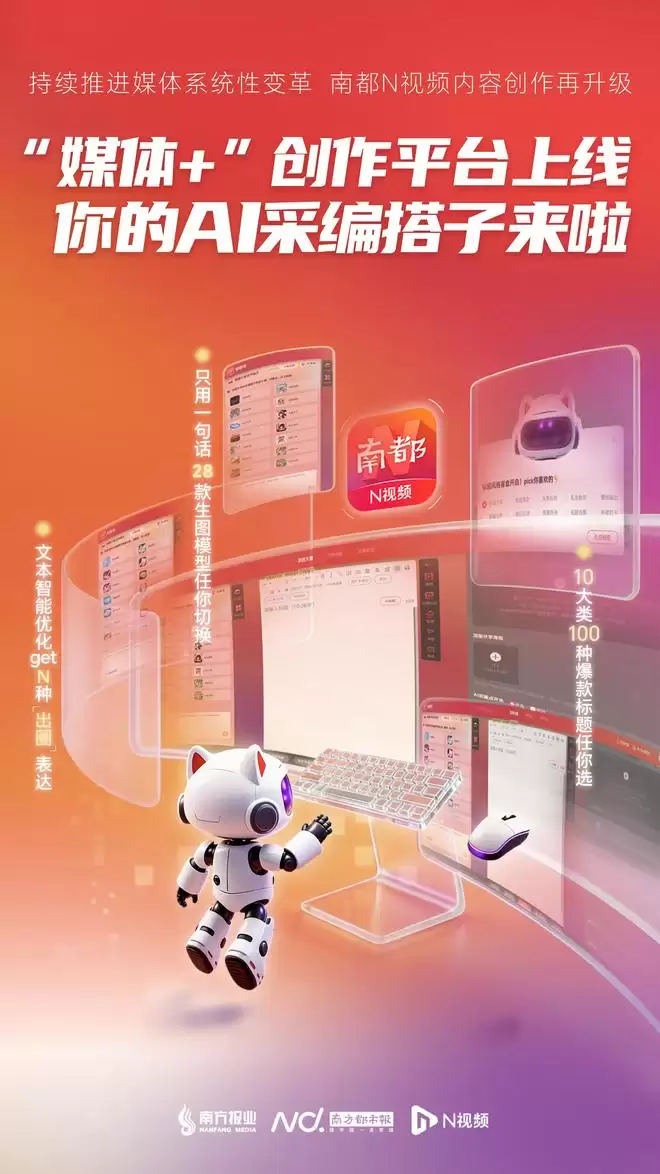 选题没方向?标题没流量?配图没创意?十二月二十六日,南都N视频“媒体+”创作平台全新上线——汇聚10大类100种爆款标题模板、24种智能问答工具、28种文生图预设模型,从选题到分发,打造真正理解内容创作者的“数字同事”。