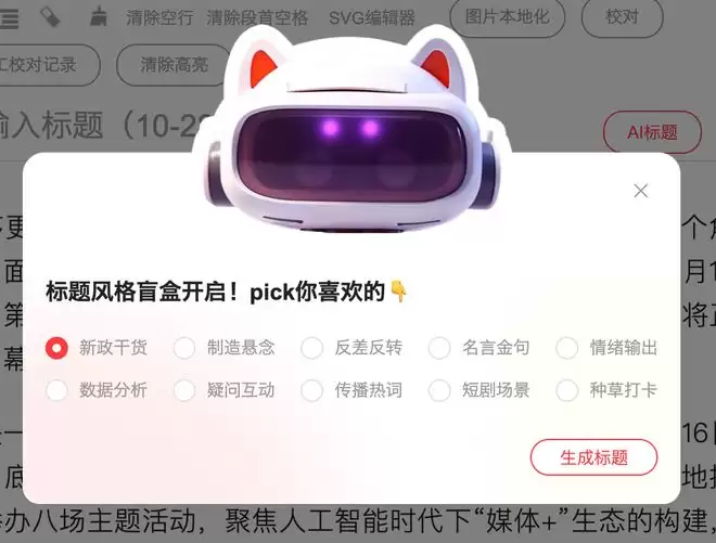不止于此。润色提质,帮助优化语句流畅度,提升专业性与可读性;精简压缩,按需将长文智能压缩至指定字数,关键信息不丢失;语气改写,同一内容秒切“网感”“温情”语态;语法纠错与事实校验,自动识别错别字、标点误用,并对明显的时间、地点、数据矛盾发出提示等。在已有稿件的基础上,所有修改均以“AI建议”形式呈现,创作者对于是否采用保有最终决策权。