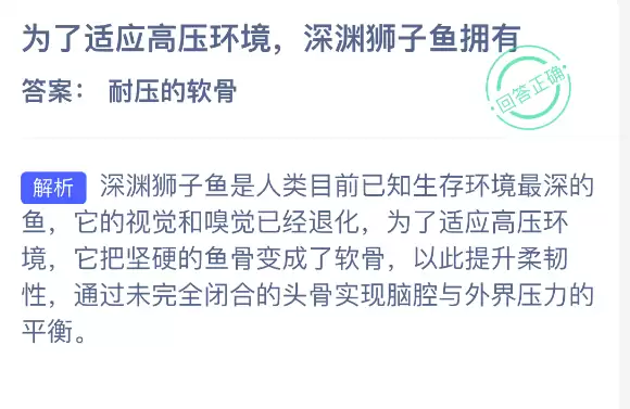 要想在深海高压环境下生存,深淵狮子鱼拥有什么特殊构造?【神奇海洋】12月25日的新题目已经揭晓!正确答案现已公布,点击领取拼图,一同为修复海洋生态贡献力量!今日的正确答案是:【耐压的软骨】。为了适应高压环境,深淵狮子鱼演化出了耐压的软骨骼。
