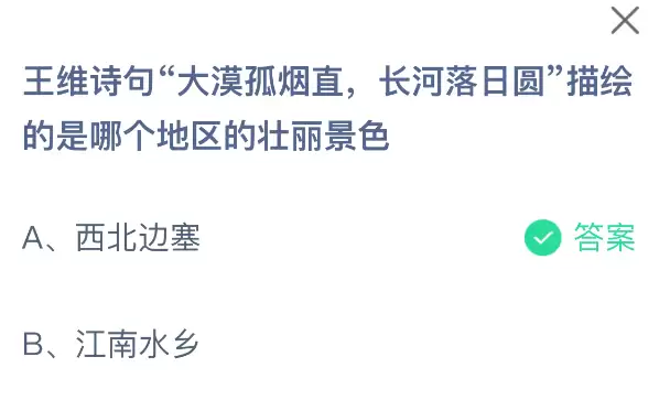 王维“大漠孤烟直,长河落日圆”描绘何地壮丽景色?2025蚂蚁庄园答案