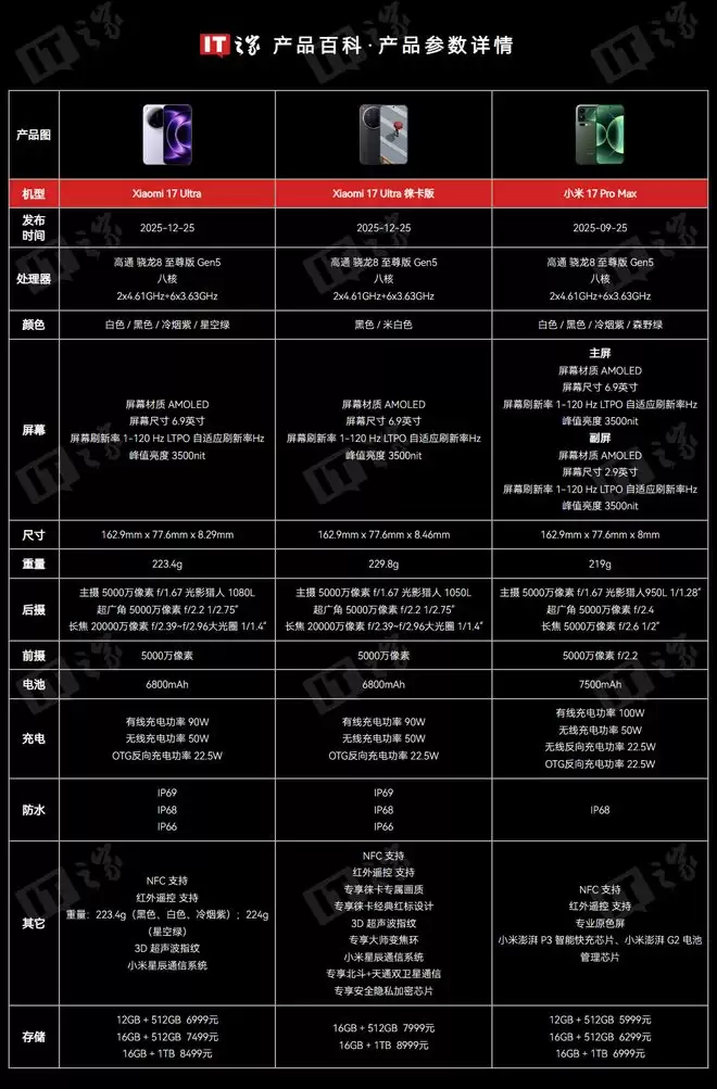 左 / 中 / 右:小米 17 Ultra 专业影像套装 / 小米 17 Ultra /小米 17 Ultra 徕卡版