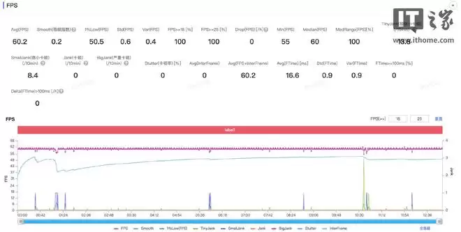 测试结束,测得游戏运行的平均帧率为 60.2 FPS,1% Low 帧为 50.5 FPS,整体也是非常丝滑流畅的,帧率曲线也基本是直的,过程中没有掉帧卡顿的感觉。