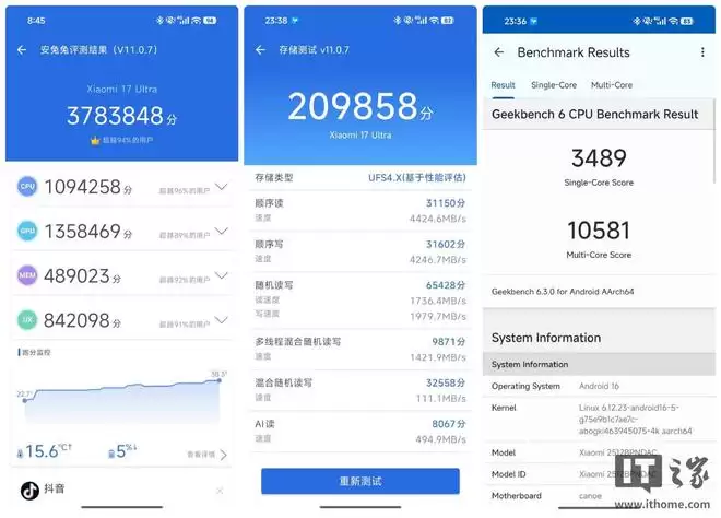 IT之家的测试数据中,小米 17 Ultra 的安兔兔 V11 综合跑分可达 378 万分左右;Geekbench6.0 跑分,CPU 单核成绩约 3489 分,多核成绩突破 10000 分。