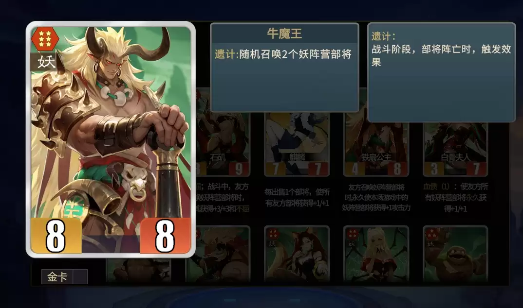 妖族阵营中有不少武将都具备召唤能力,其中与张角比较好搭配的有牛魔王和白象精。他们恰好都需要通过遗计来召唤,可在他们阵亡时进行召唤,从而形成牛魔王和白象精阵亡时触发张角血债打出唤雷,而召唤出来的武将阵亡后还能继续触发张角血债、再次进行唤雷的效果。最后再上阵石矶娘娘和白骨夫人作为保底,她们一个能在有武将被召唤时为其提供加成和不屈,提升召唤武将的作战能力;另一个能在召唤时让友方永久叠加属性,从而增加阵营强度。最后再补上一个相柳针,针对对方核心即可。