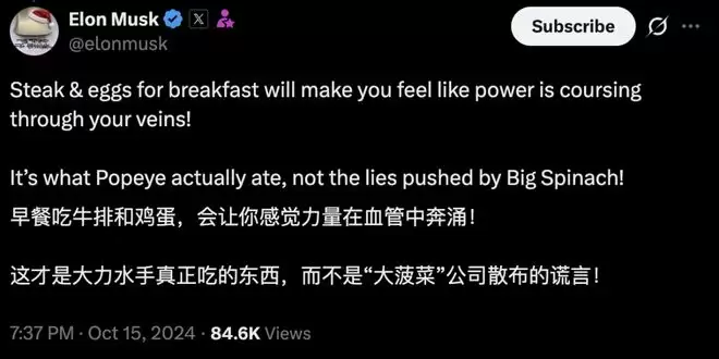 他还曾在X平台上发推文,将牛排和鸡蛋比作「大力水手真正吃的东西」。