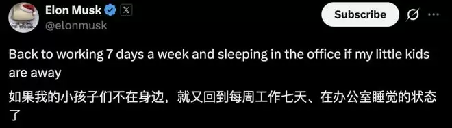 最近,马斯克又在X平台上表示,如果孩子们不在身边,就又回到每周工作七天、在办公室睡觉的状态。