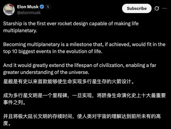 实现生命的「多行星化」,一直是马斯克致力追求的梦想,他认为这将是跻身生命演化史十大重要事件行列的事情。