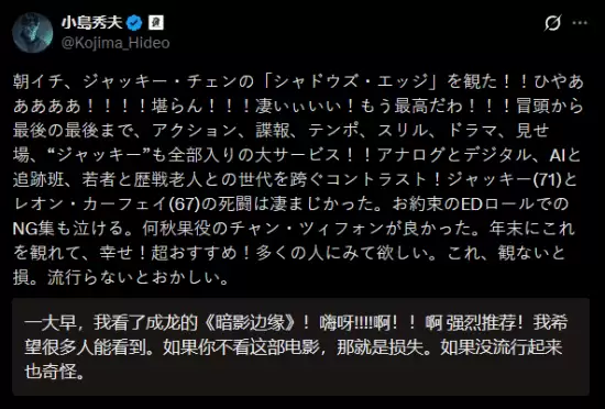 近日,知名游戏制作人小岛秀夫也在影院观看了这部影片,在给出极高评价的同时更是一共用了18个感叹号强力推荐,并称其是“不看真的吃亏,不火实在奇怪”。