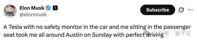 当晚,他在社交平台发文称,自己亲自体验了一次无安全员的Robotaxi测试,并直言体验近乎「完美」。