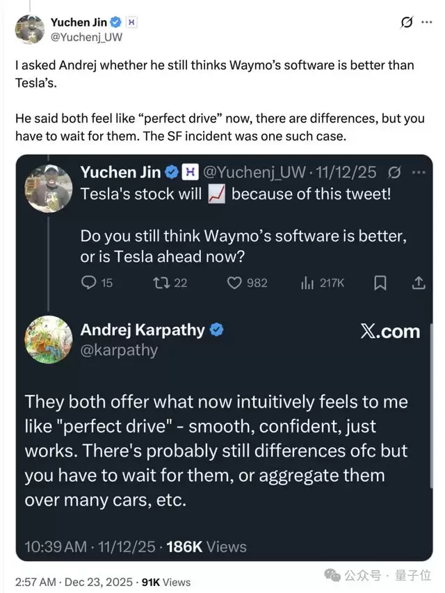 卡帕西的回应是:Waymo和特斯拉的驾驶体验都已经接近「完美驾驶」,确实存在差异,但只有在特定场景中才会显现。
