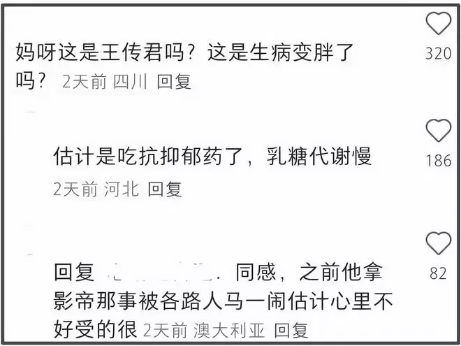 而关于王传君具体发胖的原因,网友们也做了多种揣测,有的表示他在为新角色增肥,也有的表示他估计是吃了含有激素治疗的药物,有抑郁症患者表示自己吃了相关药物肚子就变大了,猜测王传君可能也这样。