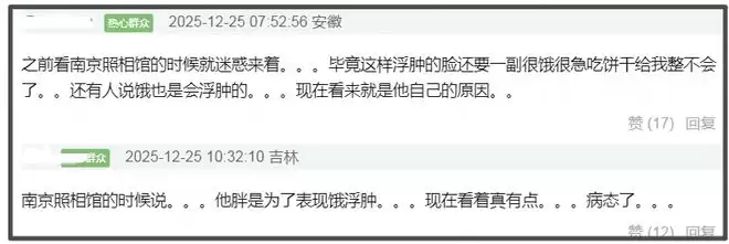 可能是王传君胖得太突然,有网友还想起了他在《南京照相馆》中的样子,称当时看剧情就觉得迷惑,不太理解为何要用浮肿的脸演绎很饿的剧情,如今看来可能就是自己的原因。据悉,该片拍摄了50多天,王传君在片中既有清瘦面孔也有浮肿胖脸,因此有网友表示怪不得看起来显病态。