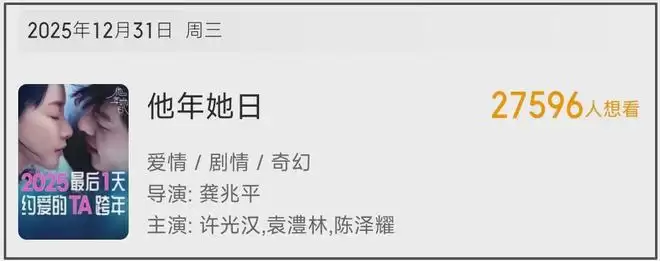 爱情题材在票房方面本就不占优势,更何况许光汉还有同题材的《你的婚礼》扑街在前,所以,观众对这部影片的兴趣并不大,在某平台上,《他年她日》的想看人数只有不到3万人。