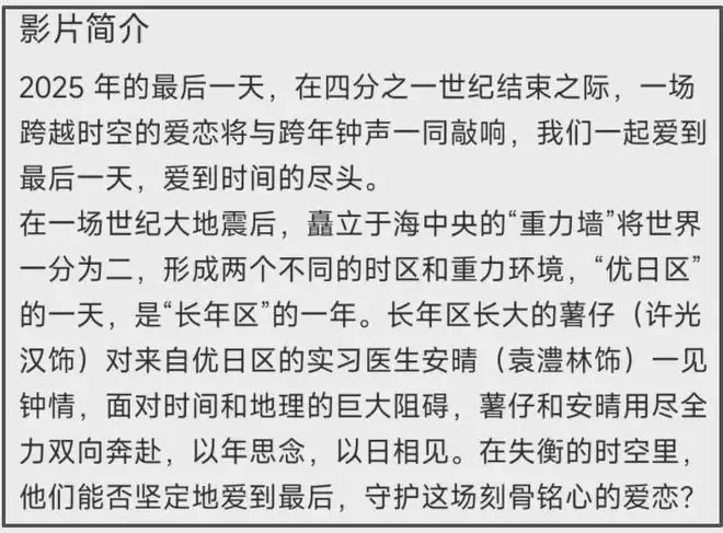 该片是跨年档唯一一部爱情类型的影片,由许光汉主演,加入了奇幻的时间设定,讲述的是在失衡的时空中男女主角相爱的故事。