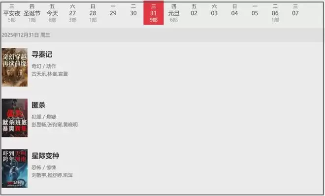 2025年最后的电影热档期来了,那就是跨年档。目前,已经有15部影片官宣在该档期上映,其中有9部影片在12月31日上映,比如《寻秦记》等;其他6部影片则会在1月1日上映,比如《过家家》等。