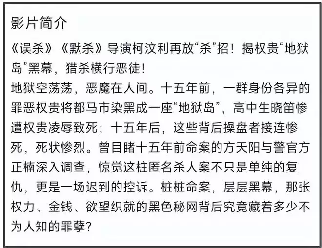 继《误杀》和《默杀》之后,柯汶利导演又带着他的新片《匿杀》来了。这一次,导演将“杀”招对准了权贵,表示要揭权贵“地狱岛”黑幕,猎杀横行恶徒。宣传语看上去很带感,但是观众却审美疲劳了,不知道导演想“杀”到什么时候,反正观众有点看够了。