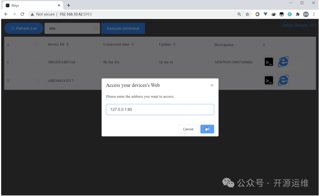 客户端设备上编译运行 rtty 程序。C 版本极其轻量,适合嵌入式环境。Go 版本容易交叉编译。运行后就能在网页上看到设备了。