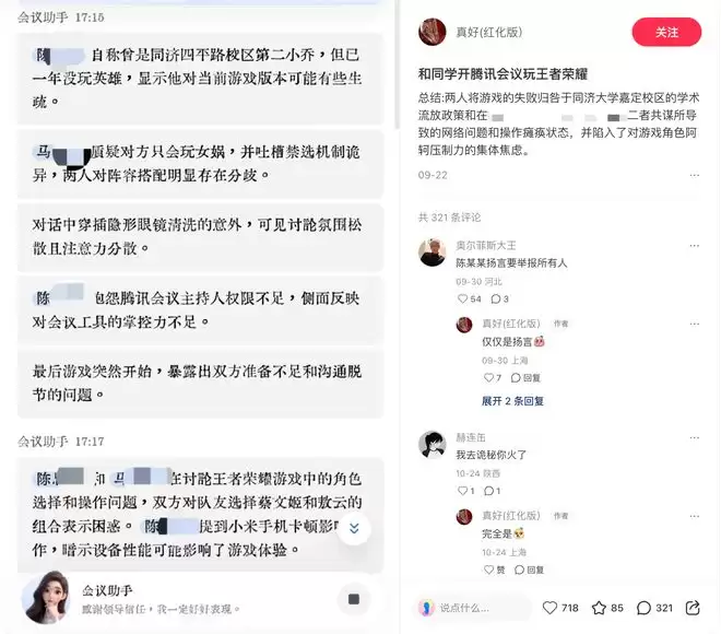 有网友在小红书上分享,在腾讯会议里开黑,明明是打游戏打急眼了,在那互相甩锅。结果 AI 纪要一出,瞬间给升华成了各种职场最新话。