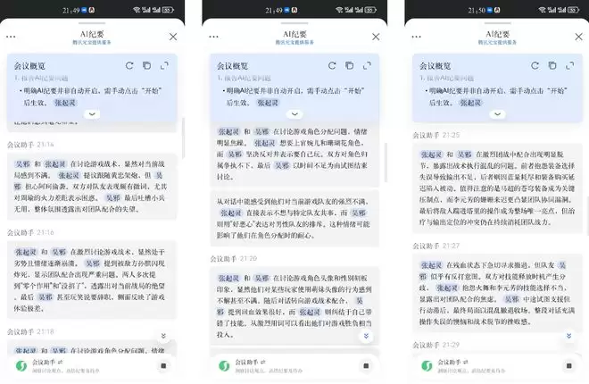 在游戏的实时过程中,腾讯会议会每隔两分钟,就自动推送最新的会议纪要。我们只需要开启会议,把它放在一边,它就能实时把我们的对话全部整理好。