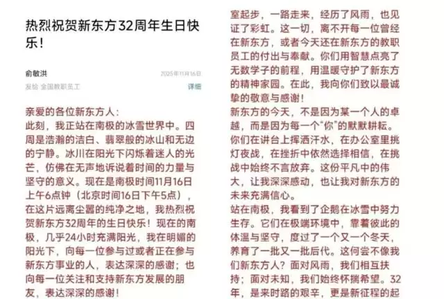 11月16日,俞敏洪在南极向新东方全体员工发出了一封公司成立32周年的贺信。信中,俞敏洪通过对南极严酷环境与坚韧意志的文学化描述,试图向员工传递某种长期主义的价值观和精神慰藉。