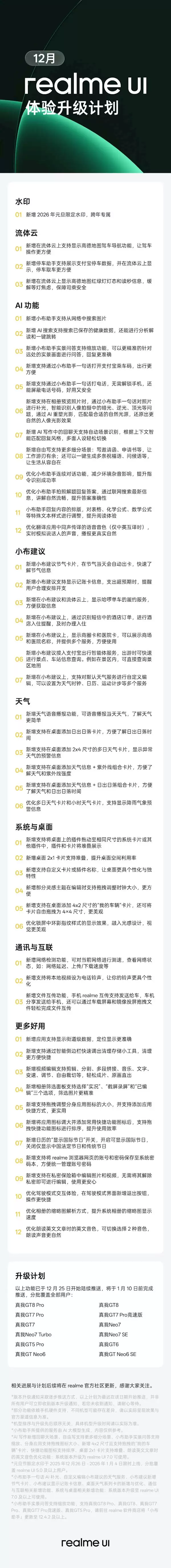 12月26日,realme官方宣布,旗下realme UI 7.0系统的12月更新已正式启动分批推送,计划于1月10日前覆盖所有支持机型,本次更新将适配包括真我GT8、真我GT8 Pro、真我GT7、真我GT7 Pro、真我GT5 Pro、真我GT6、真我GT Neo6在内的共12款机型。